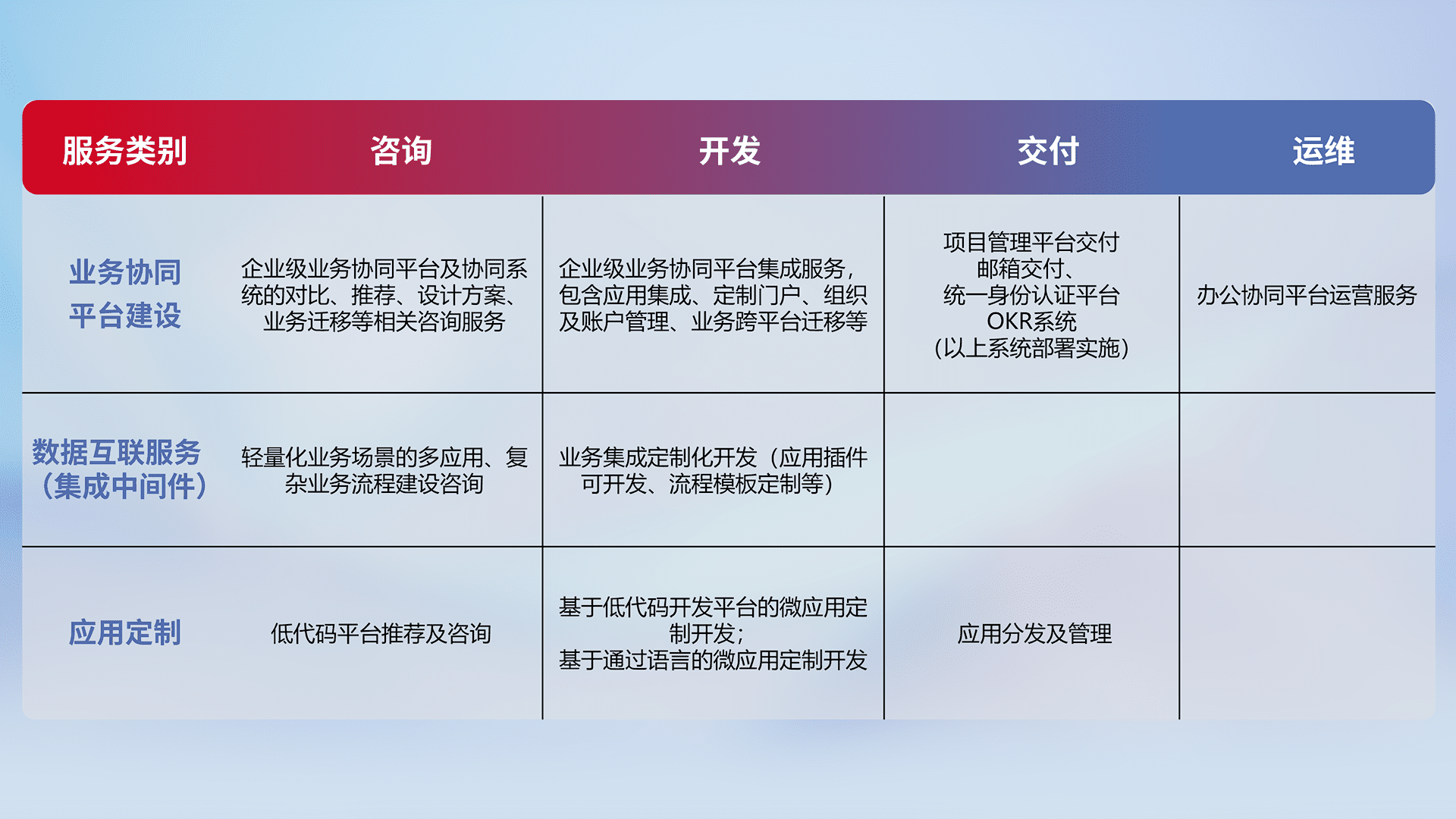 针对钉钉、、、、企微、、、、IDaas等平台级产品提供产品的规划、、、方案、、、、交付、、、定制化开发等服务,,,实现如统一协同办公、、智能客户服务、、混合会议管理、、、智能数据查询、、、、等业务场景,,实现数字化转型。。